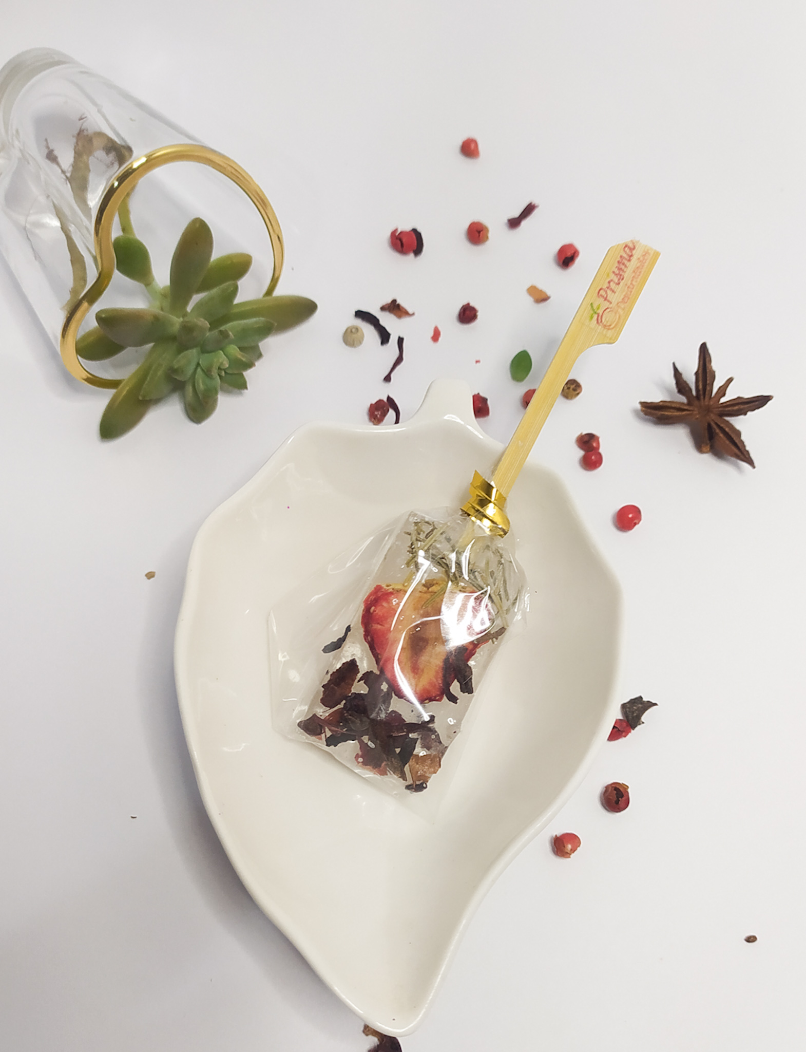 com laranja, limão, morango, pitaia roxa, kiwi alecrim, calêndula, anis estrelado, camomila, lavanda e erva doce.